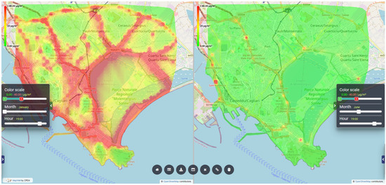 These results validate the model’s capability to accurately estimate the environmental impact of vehicular traffic in the city of Cagliari across all seasons. Notably, the lower MSE and MSEP values observed in spring and summer suggest better predictive accuracy during these periods, although the R2 values remain consistently high across all seasons, reflecting strong agreement between predictions and observations. Given its robust performance, the model is well suited for integration into a web-based platform. This enables stakeholders to simulate and analyze various traffic and pollution scenarios, supporting data-driven decision making to mitigate environmental impacts. The platform can generate detailed seasonal maps by leveraging high-resolution output, enabling the in-depth spatial analysis and visualization of pollutant distributions and traffic-related emissions throughout the year.