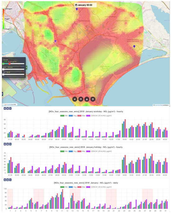 Figure 7. Air quality comparison. The top panel displays the NO2 concentration map for the AVG scenario in January 2019. In the bottom panel, after selecting a point on the map, the average hourly NO2 concentrations throughout the day are compared across three scenarios (AVG, MIN, MAX) with measured values from the nearest monitoring station shown as a placeholder (in this case, the CENCA1 located on the left part of the map). In the AVG scenario, AERMOD input (NO2 emissions) is calculated hourly by combining emission factors with the average vehicle fleet for each road in Cagliari. In the MIN scenario, the input (emission loads) is based on the average vehicle count minus its standard deviation, while the MAX scenario represents the average vehicle count plus the standard deviation, applied to each road and hour. The pink areas highlight Saturdays and Sundays. - Air Quality by Wind Direction: Analyzes pollutant distribution for each scenario under varying wind conditions.