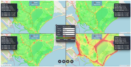The primary components of the AERQ visualization tools are the maps, which occupy the entire window area. The application uses OpenStreetMap as a background layer—a globally updated, open-source map maintained by a community of volunteers [37]. Over this base map, additional GIS layers are included (e.g., heatmaps and streets) to provide an effective, layered representation of data.