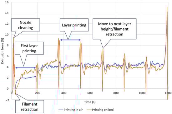 A typical measurement is shown in Figure 2. The force data were recorded during the entire printing process. The first peak in the force graph corresponds to the nozzle cleaning phase, in which the printer extruded two short lines on the left side of the printer bed to clean the nozzle, remove material residue, and establish a constant flow; in this step, the extrusion speed and layer thickness were controlled by the printer firmware. The print head then moved to the center of the bed and began printing using configured settings. In this stage, the force increased as the molten polymer was forced through the nozzle onto the bed surface. When printing in air (blue curve), the recorded forces were lower as the material was able to flow freely through the nozzle without any backpressure from previously deposited material.