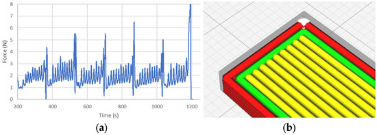 (a) Force measurements—small peaks in each printing layer—B20, T200 s20, (b) schematic of printing layers in slicer software right-red and green lines present outer walls printing lines, yellow are infill printing lines.