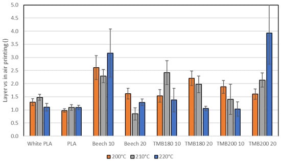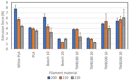 A higher extrusion temperature should reduce the viscosity of the melted polymer and thus require a lower extrusion force. This was evident for printing with white PLA, pure PLA, PLA with untreated beech wood particles (10%), and thermally treated wood particles TMB180 (Figure 5). This was not so obvious for samples with TMB200 wood. The decrease in extrusion force with higher temperature could be quite high, e.g., for white PLA, from 7.8 N at 200 °C to 4.4 N at 220 °C, and for filament with 10% beech particles, from 6.2 to 3.2 N. There was no clear trend for the TMB200 samples, but this was probably due to the fact that the nozzles often clogged during printing, and therefore, an accurate measurement of the average force was not possible.