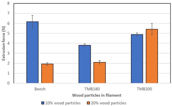 The porosity of the filaments could also affect the extrusion forces. Filaments with more wood particles exhibit more voids in the cross-section, which could affect the heating and flow of the material. In an earlier study [20], the lowest porosity (8.4%) had specimens 3D printed from B10, followed by 20% TMB200 (11.5%) and 10% TMB200 (15.3%). Specimens with B20 and 10% TMB180 had similar porosity (19.8 and 19.9%, respectively), and the highest porosity was in specimens with 20% TMB180 (20.6%). However, it should be noted that the porosity and density of 3D-printed specimens depend on many parameters such as printing settings, the moisture content of filaments, etc. Nevertheless, most of the variables occurring in 3D printing influenced the filament loading in this experiment—the density of raw materials, the density of filaments (possible voids in filament cross-sections), and anomalies that occur during printing (nozzle clogging, uneven material flow, the formation of gasses at higher extrusion temperatures, moisture in filament, etc.). There is a correlation between the density/porosity of the filaments and the extrusion force—the higher the density, the higher the extrusion force, since higher-density composites exhibit a greater resistance to flow [26].