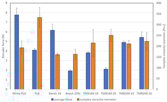 Wood particles can considerably influence the rheology of wood-PLA composite material [18]. The amount, type, and morphology of the particles and their pretreatments can have a significant effect. The rheological properties were measured at a temperature of 200 °C on 3D-printed discs. The discs were 3D-printed with a solid infill, but even with these settings, there were still voids in the printed material, which could affect the rheological properties. The average complex viscosity, measured at an oscillation frequency of 100 rad/s, is shown in Figure 7. This speed correlates with speeds used during extrusion and 3D printing, where shear rates between 5 and 500 s−1 are expected [28,29]. It is evident that the viscosity increases for wood-PLA filaments with a higher wood content for beech and TMB180 and TMB200. One of the expected results is the complex viscosity of pure PLA, which is the highest measured among all materials tested. This might be related to the porosity and density of the material.