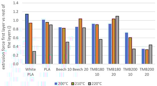 Extrusion force—first layer vs. rest of the layers (ratio) for different materials and printing temperatures.