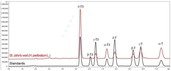 Chromatograms of tocotrienol (T3) and tocopherol (T) homologue (δ, γ, β, and α) separation by RP-HPLC-FLD in St. John’s wort (H. perforatum L.) and standards.