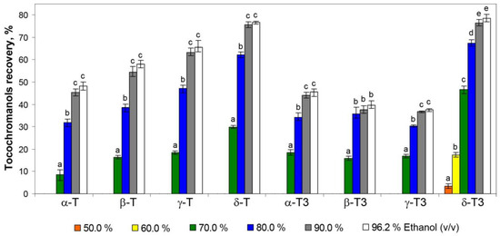 The recovery of tocopherol (T) and tocotrienol (T3) homologues (δ, γ, β, and α) from residues of St. John’s wort tea infusions by using different concentrations of hydroethanolic solutions (50.0–96.2%). As a reference (100% recovery), a saponification protocol was used. Different letters within the same tocochromanol indicate statistically significant differences at p ≤ 0.05.