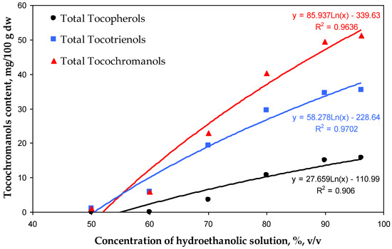 Correlations between the concentration of hydroethanolic solutions (50.0–96.2%) and the contents (mg/100 g dw) of total tocopherols, tocotrienols, and tocochromanols recovered by those solutions from residues of H. perforatum tea infusions.