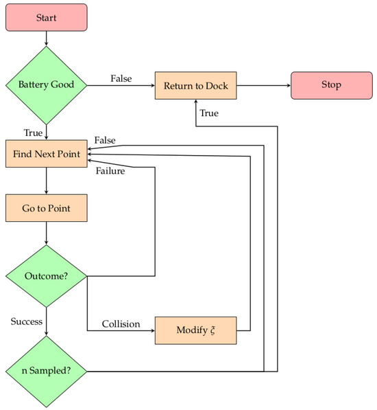 Inspired by behavioral robotics approaches, the developed behavior is intended to address the challenge of moving a manipulator in a cluttered environment without the arm having visual awareness by adopting a highly adaptable schema. Shown in Figure 2 the robot monitors its battery usage and returns to the docking station when the mapping stops. While the battery is sufficient and a user-defined number of sampled points, n, has not been measured, the robot performs a Bayesian optimization loop that involves using the current model to find the next best point to measure, traverse to that point with the arm, and modify the exploration parameter described in the previous section based on the number of consecutive collisions experienced. The return-to-dock and modify- behaviors are more trivial, while there is more nuance occurring for the find-next-point and go-to-point behaviors. When finding the next point, the GP from (1) is requested, and a random sample of twenty-five points is calculated from it using (2). The acquisition function shown in (4) is then used to determine the highest value point, which is passed to the go-to-point behavior. From there, the motion planner for the body and manipulator is called for the execution of the goal. During this execution, the force on the manipulator’s end effector is monitored, and if the force threshold is crossed, the collision outcome will result instead of success or failure, based on the motion planner results.
