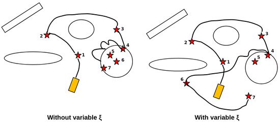 Trajectory diagram showing a theoretical execution of way-points shown as red stars in a sequential order indicated by the numbers with and without modifying the parameter , according to Equation (5). The quadruped robot is shown as an orange rectangle, and environmental obstacles are shown as various white shapes.