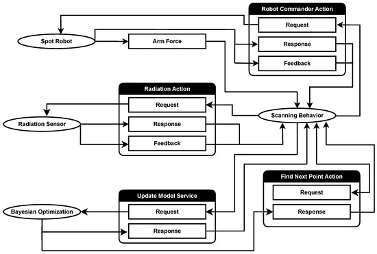 In Figure 5, the ROS2 communication for this application is described. Only select interfaces, such as topics and nodes, are displayed for clarity purposes, and the names have been simplified. The scanning behavior node works with the other three nodes in order to perform the behavior described in Figure 2. This includes monitoring the force on the manipulator and sending movement commands to the main Spot ROS2 wrapper node. It also requests for the radiation sensor node to take a measurement for a specified duration, returning the current count number as feedback and the final average as a result in counts per second. The same node also requests the Bayesian optimization node to update the Gaussian model after new measurements are taken and requests new points to move towards based on the most current model.