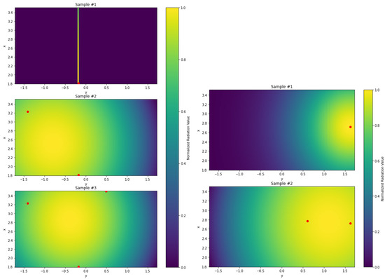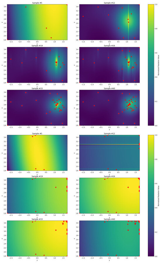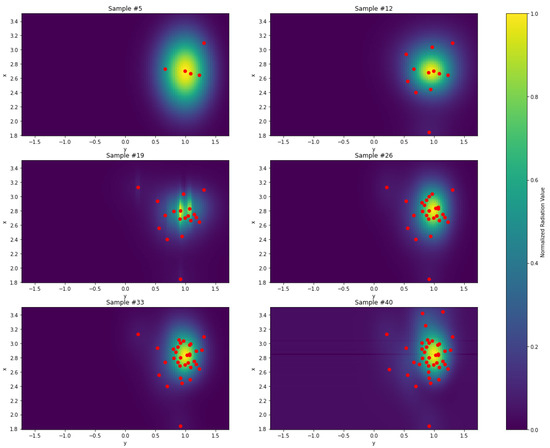 Acquisition functions allow us to calculate the value of measuring at any coordinate, x. We selected the probability of improvement as the acquisition function due to its simplicity, intuitive appeal, and ease of adjusting the balance between exploiting regions of high radiation and exploring areas with greater uncertainty. Equation (3) shows that the probability of improvement at coordinate x is the probability that the value from Equation (2) is greater than the highest currently measured value, .