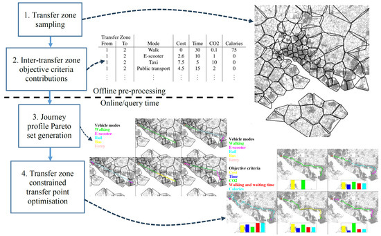 While our transfer point optimisation procedure is driven by time minimisation, constraining the transfers to limited size transfer zones provided the mechanism by which the objective criteria characteristics of the original journey profiles are preserved. Quickly generating truly optimal and full Pareto sets of multi-modal journeys for the criteria considered, without relying on pre-processing and transfer-zone sampling as this work does, currently remains an open area of research. However, the issue of presenting too many journey options to commuters warrants methods that limit the sizes of the Pareto sets generated. A related future research direction could involve trials into the influence that presenting different sets of journey alternatives has on travel behaviour for different demographics and personas. Another future direction is to investigate how shortest-path algorithms can incorporate preference criteria such as avoiding motorways, large numbers of turns and lane changes, and to use such algorithms in modular multi-modal journey-planning algorithms such as that presented here.