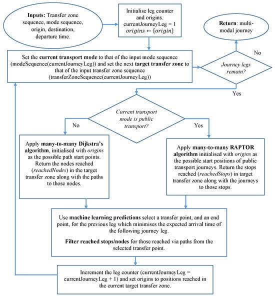 Our methodology side steps the issue of the large solution space of possible transfer locations between pairs of transport modes using a two-step approach. Firstly, a Pareto set of journey profiles is generated based on aggregated transfer zones. Secondly, integrated and adapted versions of existing shortest-path algorithms for open and public transport networks, with various speed-up techniques, are used to optimise the transfer points and paths between transfer zones in a procedure guided by neural machine-learning predictions. A novel hybrid k-means and Dijkstra’s algorithm was introduced for determining sets of transfer zones which accounts for transport network topology and local geography. In general terms, this work provides another example of how learning and optimisation can be beneficially integrated.