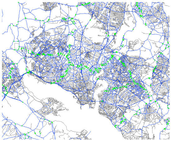Figure 4 displays the boundary nodes (green dots) of partitioned regions and cross-region shortest paths (blue); all of the grey edges can be pruned in a Dijkstra’s search when the current “resolved/scanned node” is not in the origin or destination region.