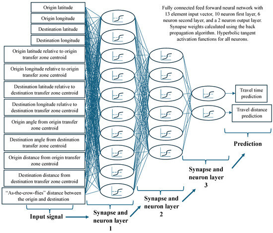 In ML-TZSA, feed-forward neural networks are used to rapidly approximate shortest time paths from anywhere in an origin transfer zone to anywhere in a destination transfer zone in any transport network. As such, we train a separate neural network for each pair of origin and destination transfer zones and each transport mode. Regarding the training of each neural network, we firstly generate the neural-network structure according to the specified number of input features, output responses and the numbers of neurons in each layer. In this case, there are 13 input features and two output responses (travel time and distance). The input features for making a prediction include origin and destination longitudes and latitudes (4 features); origin and destination longitudes and latitudes relative to their respective transfer-zone centroids (4 features); the angles and distances of the origin and destination relative to their respective transfer-zone centroids (4 features) and the “as-the-crow-flies” distance between the origin and destination (1 feature). These features can be calculated much more rapidly than the exact shortest path between an origin and destination can be, as can a forwards pass of a neural network for making a prediction based on these features.