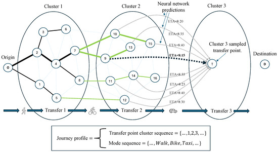 Figure 3, as well as being the candidate locations for the next transfer point in cluster 2. In summary, machine-learning predictions for the next journey leg are used to decide on a path through the previous leg’s many-to-many shortest-path tree and commit to a single path sub-tree of the current leg’s many-to-many shortest-path tree. The issue that machine-learning predictions can exhibit inaccuracy is not too critical given that the machine-learning predictions are only used to choose a sub-tree from a many-to-many shortest-path tree.