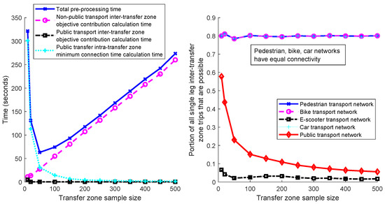 Section 4.2 for different transfer-zone sample sizes. For transfer-zone sample sizes of 50 and above, pre-processing times increase linearly with transfer-zone sample size. This is because the number of calls of Dijkstra’s algorithm required for calculating open transport network inter-transfer-zone objective criteria contributions is equal to the number of transfer zones. The task of generating the transfer zones is only dependent on the size of the pedestrian transport network and not the number of transfer zones. For low transfer-zone sample sizes, the task of calculating minimum connection times for consecutive public transport legs takes a longer amount of time because there are more possible public transport connections in larger transfer zones. The calculation of inter-transfer-zone objective criteria contributions in the public transport network takes the least amount of the total pre-processing time because public transport routes are pre-defined and the public transport network is generally a fraction of the size of any of the open transport networks.