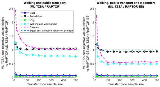 Figure 9 provides results for a comparison between ML-TZSA and RAPTOR based on the best objective values found for each criteria for each of the 2000 test queries. The results are presented as relative values, where values below 1 indicate that ML-TZSA finds better objective values for particular criteria compared to RAPTOR on average. When only walking and public transport are available, RAPTOR finds slightly faster and less strenuous (in terms of calorie expenditure) journeys on average. This perhaps is not so surprising considering that ML-TZSA’s RAPTOR component is relatively constrained by the maximum transfers and transfer-zone sequence imposed by journey profiles. This reinforces the idea that ML-TZSA is best considered an option for augmenting the offerings of MaaS apps rather than being a replacement for their existing ones. However, in all other cases, ML-TZSA finds better best solutions than RAPTOR on average. This is true for all criteria when the available modes are walking, public transport and e-scooters, and for the criteria of walking and waiting time, cost and CO