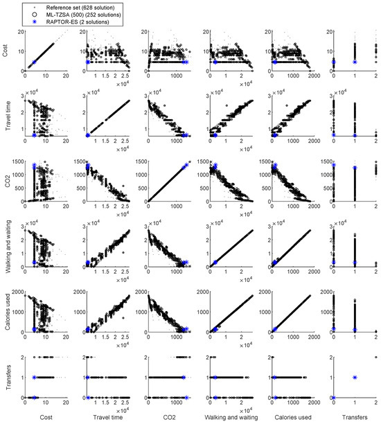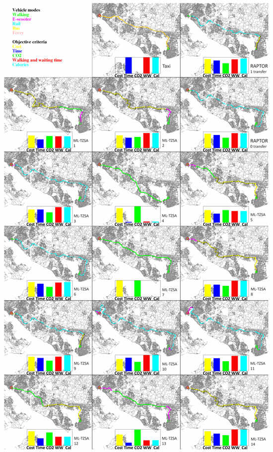 Figure 10 displays a sample of routes generated by ML-TZSA (500), as well as RAPTOR-ES’s two non-dominated solutions (top-right) and a pure taxi route (top-middle). The bar charts indicate the overall relative quality of each solution with respect to the objectives of cost, time, CO