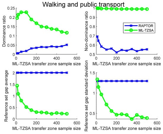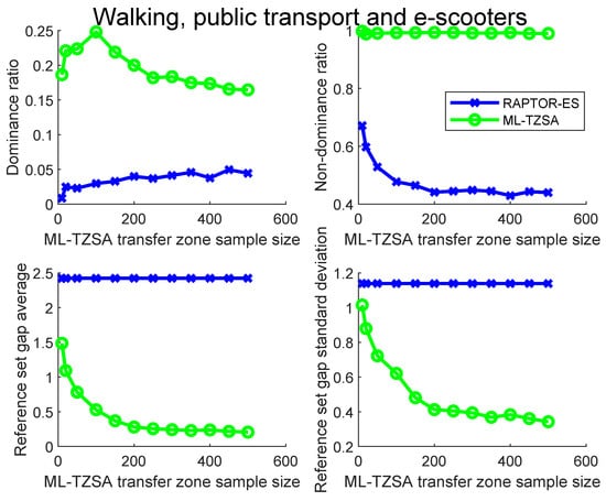 We now turn our attention to the quality of the Pareto sets generated by ML-TZSA and for completeness include results for those of RAPTOR solution methodologies. Our Pareto set metrics include dominance ratio, non-dominance ratio, reference set gap average and reference set gap standard deviation. Dominance ratio and non-dominance ratio are Pareto set metrics based on comparing the Pareto sets generated by two different methodologies for the same query directly against each other. The dominance ratio of one Pareto set is defined as the portion of its solutions that dominate at least one solution from the Pareto set it is being compared with. The non-dominance ratio of one Pareto set is defined as the portion of its solutions that are not dominated by any solution from the Pareto set it is being compared with. The reference set gap average of a Pareto set is defined as the average distance (in normalised objective value space) between each of a reference Pareto set’s solutions and the nearest solutions in the Pareto set being measured. This measure is zero when a solution method can generate the same Pareto set as the reference set. Regarding the reference set, ideally this would be the optimal Pareto set; however, currently no algorithm scalable enough exists to calculate it within a reasonable amount of time for the large sized instances considered here. Instead, we generate a reference Pareto set for each query composed of the combined set of mutually non-dominated solutions from all available solution methodologies. The available solution methodologies in this case are ML-TZSA for all transfer-zone sample sizes considered, as well as those generated by RAPTOR solution methodologies. Wherever an average can be calculated, a standard deviation can also be calculated; the reference set gap standard deviation measures the variance in the average distances between each of a reference set’s solutions and the nearest ones in the Pareto set being evaluated. Low values of this metric indicate a Pareto set consisting of a diverse set of solutions, which is a desirable feature of the solutions we would like to provide to a commuter.