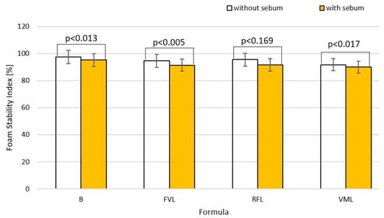 - Paired t-test to evaluate the effect of adding model sebum to the cleansing cosmetic solution on the foam stability index.