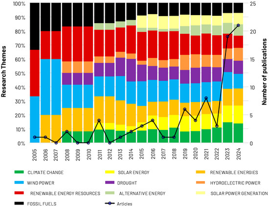 The evolution of research in renewable energy and climate change reflects the growing need for optimized technologies to address energy and environmental challenges. This increasing focus underscores the importance of policies and investments that drive innovation in sustainable energy solutions. While climate change and renewable energy have been dominant topics since 2005, there has been a notable rise in studies on specific technologies such as solar and wind energy [28,29,30,31,32,33,34,35,36]. Solar energy in particular has gained prominence after 2020, highlighting its potential for integration into energy matrices affected by megadroughts and its competitiveness compared to other renewable sources [37,38,39,40,41,42,43,44].