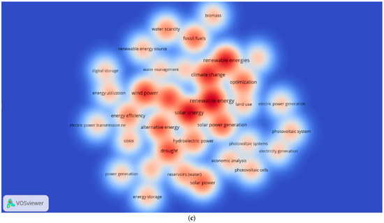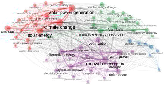 An additional aspect to consider in the density map is the intensity of the color associated with the keywords in each cluster, indicating the main critical points in the research field. These critical points are closely linked to the most relevant keywords in this scientific domain. Five clusters are identified, with the first three being the most predominant (Table 2). The red cluster, which contains the most significant number of terms, includes keywords such as “Economic analysis”, “Energy”, “Reservoirs (water)”, “Solar energy”, and “Solar power generation”, centered around the term “Climate change”. The blue cluster, centered on the primary term “Wind power”, is surrounded by parameters such as “Energy efficiency”, “Energy utilization”, “Renewable energy resources”, and “Water scarcity”. Similarly, the purple cluster has “Alternative energy” as its central term, with surrounding parameters such as “Drought”, “Hydroelectric power”, and “Power generation”. The yellow cluster includes parameters like “Electricity generation”, “Energy planning”, and “Photovoltaic system”, centered around the term “Optimization”. Finally, the green cluster contains terms such as “Biomass” and “Renewable energy sources”, revolving around the central term “Fossil fuels”.
