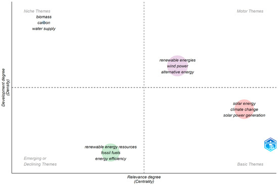 Another significant aspect is the thematic map of keywords based on their relevance and degree of development within the research fields, as shown in Figure 4. This map is divided into four quadrants: (i) motor themes, (ii) basic themes, (iii) emerging or declining themes, and (iv) highly specialized or niche themes. The motor themes quadrant exhibits high density and centrality, indicating that these themes are well developed and highly relevant to the research field. Keywords in this quadrant include “Renewable energies”, “Wind power”, and “Alternative energy” [29,46,47,48,49,50]. These well-structured themes are expected to remain fundamental for advancing technologies that ensure energy transition and sustainability.