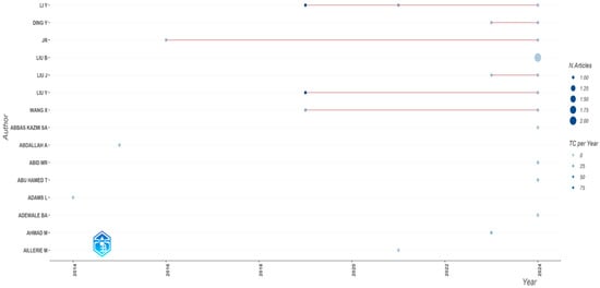 Figure 6 visualizes author productivity using a circle size to represent annual publication volume, while the circle color reflects total citations per year. The most productive author was Li Y (three publications), followed by Ding Y, JR, Liu B, Liu J, Liu Y, and Wang X (each with two publications). Li Y and Liu Y also stood out with 98 citations per year, making them the most influential researchers. High-impact contributions appear in journals like Energy (Liu D, JR), Applied Energy (Wang X), and Desalination (Liu J).