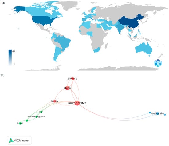 The most prominent countries in publications. (a) Map representation of the number of publications by country. (b) Strength of the collaboration network among countries based on co-authorship.