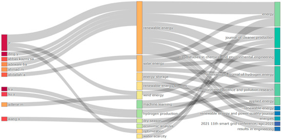 Figure 9 presents a three-field plot associating the most prominent authors, keywords, and journals within the scope of this study. This Sankey diagram visualizes the relationships between these elements, enabling the identification of flows among them. The most frequently used keywords include “Renewable energy”, “Solar energy”, and “Renewable energy sources”, aligning with those shown in Figure 7. Authors such as JR, Ding Y, Abbas Kazmi SA, and Ahmad M strongly link to the keyword “Renewable Energy”, establishing the strongest connections. Furthermore, this keyword is robustly connected to most journals, indicating that a significant portion of the publications in these journals focus on renewable energies. Additionally, keywords such as “Solar energy” and “Energy storage” are prevalent across most analyzed journals, highlighting their relevance in renewable energy research.
