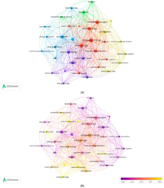 Figure 3a depicts the 35 most frequently used keywords over the past 19 years, grouped into five thematic clusters (Table 2). Keywords with at least five occurrences are included. Cluster sizes correspond to total link strength, and proximity between terms reflects their interconnection. The most frequent keywords identified were “Solar energy”, “Renewable energy”, “Climate change”, and “Wind power”. Renewable energy is the central term, frequently co-occurring with other keywords. Variations of this term, such as “Renewable energies”, also appear, reinforcing its prominence in keyword mapping.