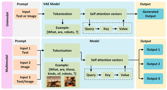 The VAE model primarily employs unimodal and multimodal approaches, as illustrated in Figure 1. A unimodal VAE processes a singular data modality, such as text, image, or numerical data. This approach compresses the input data of any type into a latent space while reconstructing the same type of data with variations from this representation. Unimodal VAE is easy to train, has a simpler architecture, and achieves high performance but fails in adaptability due to restricted diverse data type inputs. A multimodal VAE processes multiple data modalities simultaneously, such as the combination of input prompts of text, images, and numerical data. This approach encodes the inputs into a common latent space. It may reconstruct or produce outputs across several modalities, facilitating cross-modal tasks such as producing an image from a text prompt. It generates diverse and richer outputs but requires higher training with a larger dataset. In summary, unimodal VAEs are ideal for specific tasks, while multimodal VAEs are suited for comprehensive applications integrating diverse data types.