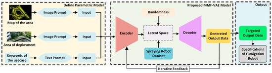 The incorporation of the proposed MMF-VAE model in designing an urban landscape fumigation service robot focuses on a structured three-stage process. The design and development are divided into the following: (i) design parameter fixation, which highlights the significance of each parameter in the robot’s development; (ii) design parameter generation using Gen-AI, comparing specifications generated with and without datasets using the proposed model; and (iii) the development of the fumigation robot, implementing the generated design specifications. Section 4.1 examines the critical role of parameters like locomotion, spraying mechanisms, and autonomy. Section 4.2 demonstrates the model’s ability to generate accurate, dataset-driven specifications and their impact on design refinement. Finally, Section 4.3 interprets the generated specifications into a functional fumigation service robot optimized for urban landscapes. Implementing the proposed algorithm involves several key steps to generate design specifications for the urban fumigation service robot. First, input data, such as design parameters and sensor information, are processed using Python libraries. The MMF-VAE model is then applied to generate design specifications based on these inputs, incorporating feedback loops for iterative refinement. The algorithm utilizes multimodal data to inform decision-making and enhance output accuracy. Each stage, from data preprocessing to model optimization and final design generation, is clearly defined in Algorithms 1 and 2, ensuring reproducibility. The integration of ChatGPT/Ollama allows for the real-time customization of design inputs.