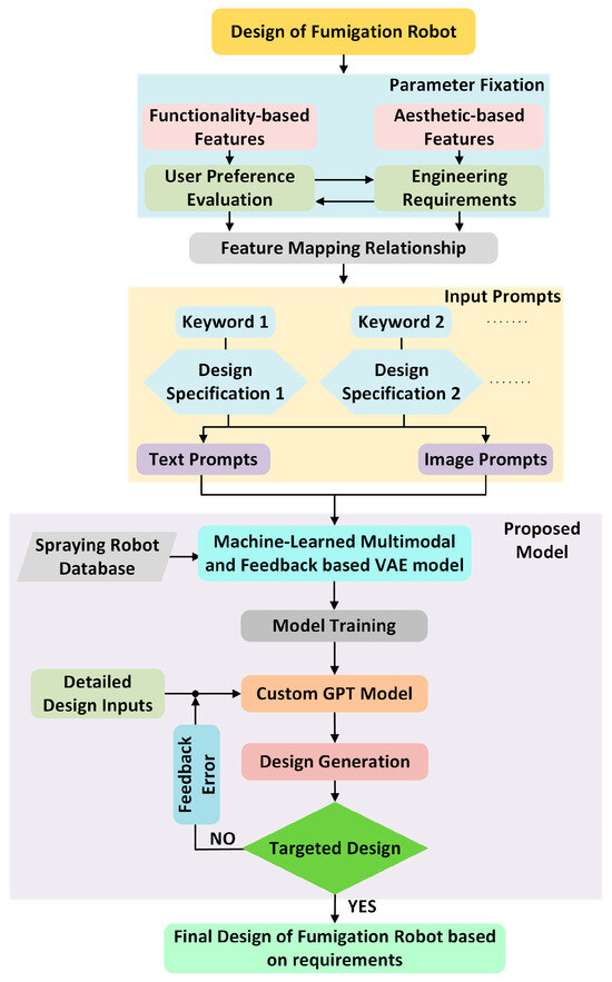 Figure 7 illustrates the systematic approach to designing a fumigation service robot using the proposed MMF-VAE model. The process begins with parameter fixation, guided by engineering requirements and user preference evaluations, ensuring that the robot meets functional and aesthetic specifications. Next, feature mapping is performed to finalize the input design parameters; then, these fixed parameters are transformed into input prompts categorized as text and image prompts. Each keyword represents the design specification requirement for the fumigation robot. These text and image prompts are given as input to the proposed model, which utilizes a spraying robot database for training. The model generates initial designs based on these inputs and incorporates a feedback mechanism to refine the outputs iteratively. Suppose the generated design fails to meet the targeted requirements (i.e., feedback error exists). In that case, the process loops back, refining the input parameters and retraining the model until a satisfactory output is achieved. Once the design aligns with the desired requirements, it is considered the final fumigation robot design. This workflow ensures that the fumigation robot is designed precisely, balancing functional performance, user preferences, and aesthetic appeal, driven by advanced Gen-AI capabilities.