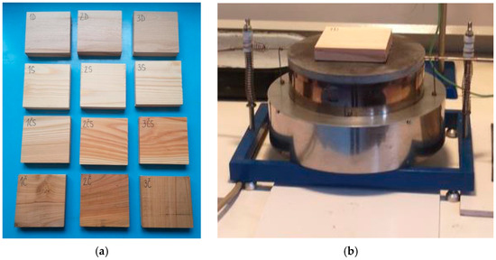 (a) Experimental samples of oak (1D, 2D, 3D); of spruce (1S, 2S, 3S); of red spruce (1CS, 2CS, 3CS) and cherry (1C, 2C, 3C) be front of experiment; (b) hot-plate device.