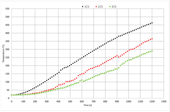 Temperature curve for red spruce wood samples at different distances (1CS, 2CS, and 3CS) from the radiant heat source.