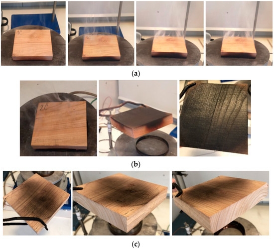 Photo-documentation from spruce experiments. (a) The 1st picture shows the start of the smoking process for 291.2 °C and at 540 s, and the 2nd picture shows the charring layer. (b) The 1st picture presents the start of the smoking process for 228.2 °C and at 630 s; the 2nd picture presents the start of the smoking process for 351.6 °C at 1020 s; and the 3rd picture presents acrid cracks, smoking, and thermal degradation (for 410.4 °C and at 1155 s). (c) Pictures for 3S samples without charring layer.
