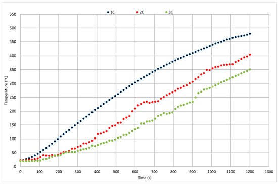 Temperature curve for cherry wood samples at different distances (1C, 2C and 3C) from the radiant heat source.