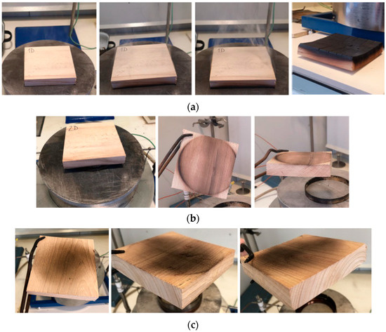 Photo-documentation from oak experiments. (a) The 1st picture shows smoldering (for 273.1 °C and at 525 s), the 2nd picture shows significant smoldering (for 299.8 °C and at 585 s), the 3rd depicts charring of the side sample parts (for 353.9 °C and at 720 s), and the 4th picture shows slight sample bending (for 411.1 °C and at 900 s). (b) The 1st picture is the sample before the experiment; the 2nd picture shows smell development and a faint circular imprint on the bottom part (for 249 °C and at 780 s); and the 3rd picture presents slight sample bending, as well as charring of the bottom and side sample parts (for 401.8 °C and at 1200 s). (c) The 1st picture depicts sample 3D (for 90.5 °C and at 459 s); and the 2nd and 3rd pictures depict slight scorching on the bottom part of the sample, with negligible effects of radiant heat on the surface of the sample (for 285.7 °C and at 1200 s).