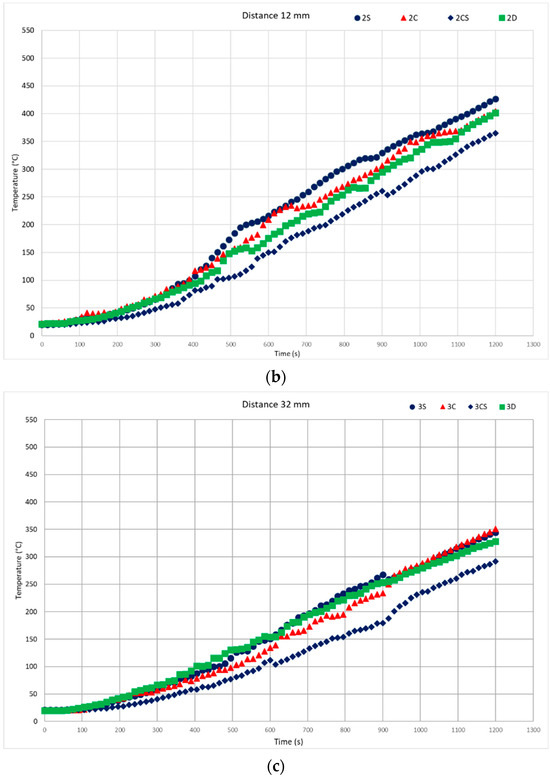 Mutual comparison of temperature curves for wood samples from the radiant heat source: (a) at distance 0 mm (1S, 1CS, 1C, and 1D); (b) at distance 12 mm (2S, 2CS, 2C, and 2D); and (c) at distance 32 mm (3S, 3CS, 3C, and 3D).