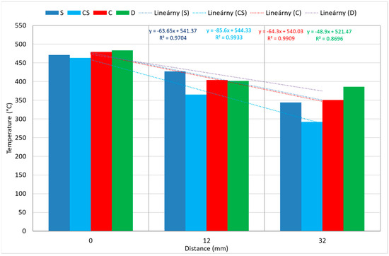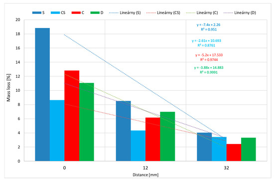 The greatest weight loss was observed in spruce, which reached 18.83%. This result suggests that spruce wood is more vulnerable to heat and may undergo more significant decomposition [31]. During the measurement, sample 1S also recorded the highest temperature, reaching 491.3 °C. Compared to the other tested samples, the highest charred-layer thickness was observed in samples 1S and 1C. Conversely, the smallest weight loss was recorded in samples placed farthest from the radiant heat source. Specifically, cherry wood exhibited the smallest weight loss, at 2.42%. These results demonstrate the impact of distance from the heat source on the thermal degradation of wood. Based on data analysis in Excel (Figure 12), it can be concluded that as the distance from the source increases, the weight loss decreases linearly.
