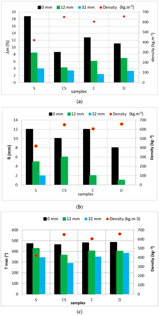 Because the time–temperature curves followed similar patterns (Figure 11), it was necessary to determine an appropriate method to quantify the observed differences. Figure 14 illustrates the comparison of experimental parameters mass loss (Figure 14a), maximal temperatures (Figure 14b), and charring layers (Figure 14c) with sample densities.