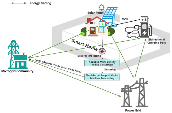 Figure 1 illustrates energy trading within a microgrid community. The households in this community are assumed to be photovoltaic, have electric vehicles, and are equipped with smart meters and home energy storage batteries. With the popularity of electric vehicles, the provision of services to the grid, homes, and buildings via Vehicle-to-Anything (V2X) technology [15] is also considered in Figure 1.