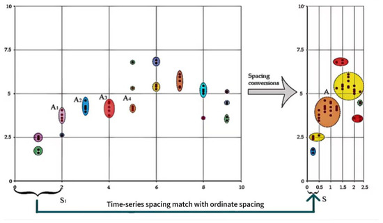 The timespan interval ( and S, as shown in Figure 2) is a very important measurable parameter in determining the quality of density clustering because it affects the initialization of the density radius. If the timespan interval is not suitable for the spacing of the y-axis, it will lead to the clustering results being non-ideal. If the timespan interval selected is too large, it will lead to more vertical space clusters. For instance, the x-axis spacing is represented as a time series, such as 5 min or 10 min. If the timespan interval is too large, such as , the results of the density clusters will deviate from the actual cluster results, and some vertical-space, little clusters could be generated. If the suitable timespan interval (S) can be mined, these little clusters, such as , , , and , could be merged into one cluster, A. This is the reason why we need to consider the timespan to suit the dimension of density clustering; it is possible for it to have a great impact on the clustering quality because of proportional variation and the position offset. The time interval transformation is shown in Figure 3.