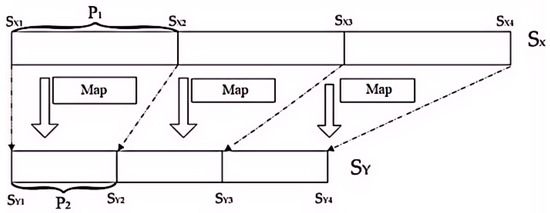 Mapping and transformation process, such as P1 (, ) transforms into P2 (, ) after mapping process.