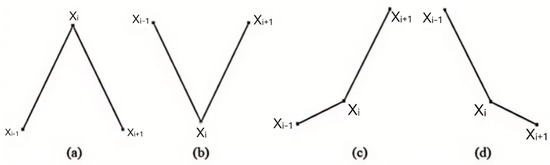 As the tendency of the demarcation point of the time series changes, the key point can affect the changing patterns. The key points in data represent the data sequence because they find the main variation characteristic. Therefore, we propose combining the extreme value method with the angle method. For , the smaller the angle of , , and is, the more likely it is to be the key point. By only scanning the dataset once, we keep the important point in the non-monotonic sequence, and according to the monotone of the three consecutive data points of the triangle length of the trip, we determine whether the intermediate data points need to retain the key points. As Figure 4 shows, in (a) and (b) are more likely to be the key points.