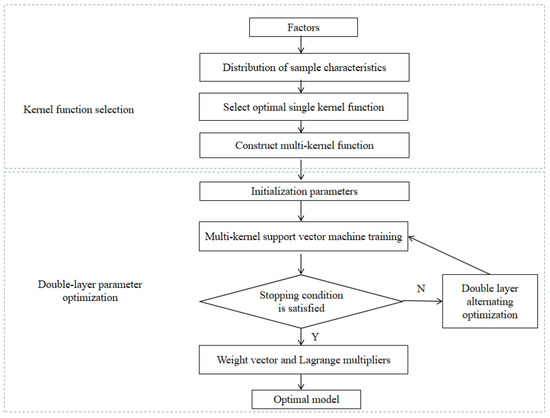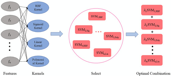 Many factors can influence time-series fluctuations; therefore, when predicting time series, the effects of the influencing factors should be fully considered, and a multi-kernel function is used to analyze the influencing factors. The multi-kernel function is a kernel function corresponding to different types of data construction and weights and combines according to the importance and the degree of each kernel function to form a multi-kernel function. As shown in Figure 5, multi-kernel functions can combine multiple types of influencing factors and adjust the weights to form an optimal function. Compared to traditional single-core functions, multi-kernel functions are more robust and accurate.