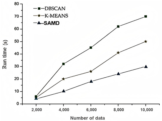 Running Time Efficiency: We discuss the changes in the running time regarding an increasing dataset. The general trend was that the running time continued to grow as datasets were added. However, our proposed multi-density method showed a more stable state. Our proposed SAMD model was more efficient than the other DBSCAN and K-means algorithms, as shown in Figure 8.